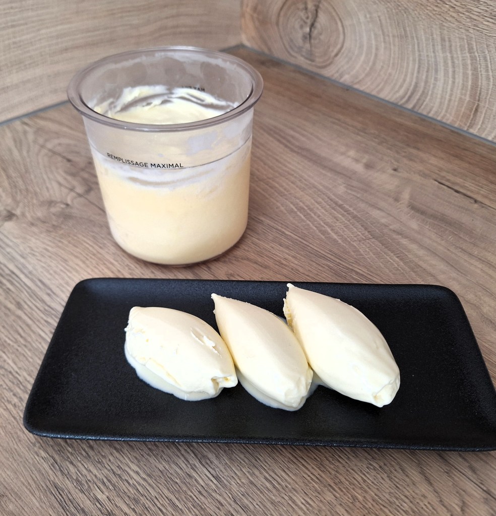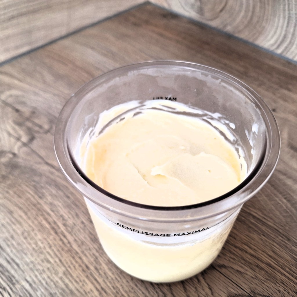 Déposez la préparation dans le bol et placez au congélateur avant de la mixer. Si vous n’avais pas la machine à glace Ninja Ice Creami, la traditionnelle sorbetière fera parfaitement l’affaire en veillant à laisser parfaitement refroidir la glace la veille de la dégustation au réfrigérateur et la turbiner le lendemain. Lorsque votre glace a terminé de turbiner et que vous la remettez au congélateur, il est important de la lisser avec une spatule ou une cuillère.